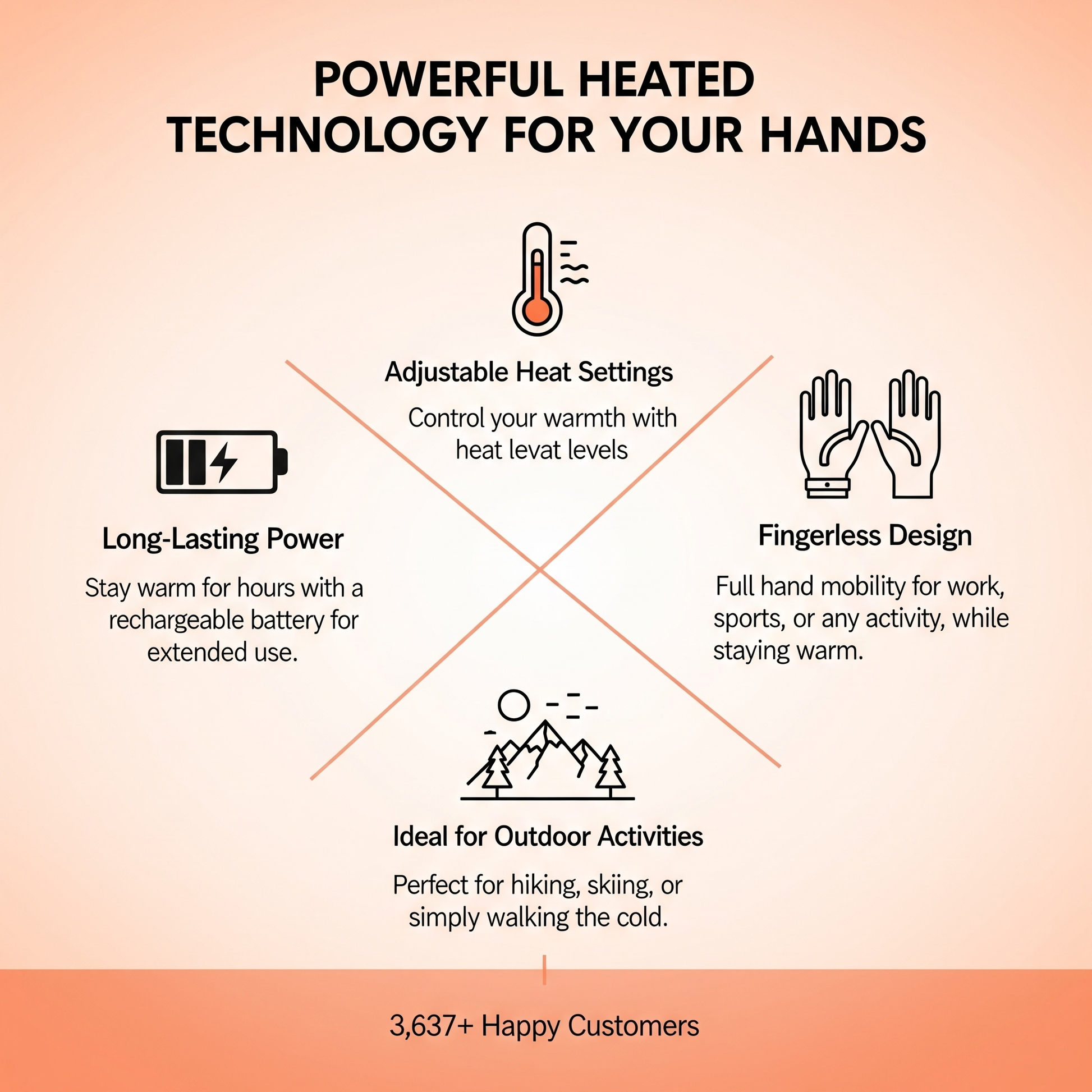 Say goodbye to cold hands this winter! These electric heated fingerless gloves come equipped with an easy-to-use display, allowing you to select the perfect temperature for your comfort. With adjustable heat settings, you can effortlessly switch from a cozy warmth to a more intense heat to keep your hands toasty, no matter the weather. The intuitive temperature control gives you the freedom to find your ideal warmth without any guesswork—comfort, right at your fingertips.